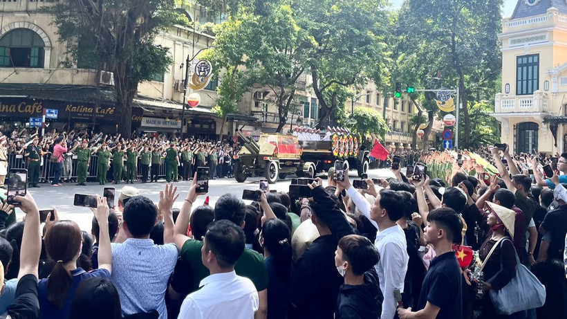 Đoàn xe chở linh cữu Tổng Bí thư Nguyễn Phú Trọng di chuyển qua phố Hàng Khay trong niềm tiếc thương vô hạn của nhân dân. (Ảnh: ĐÌNH TUẤN)
