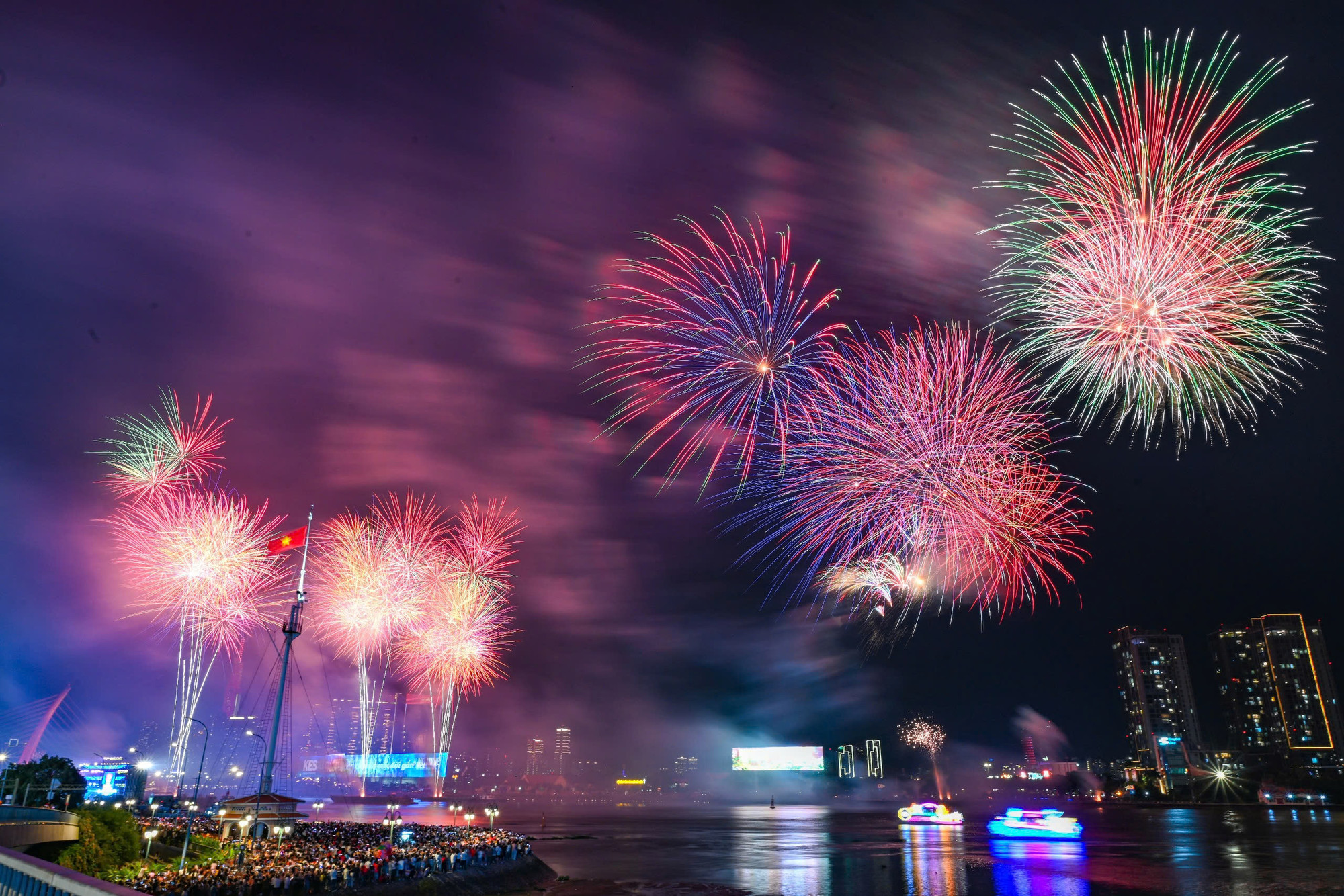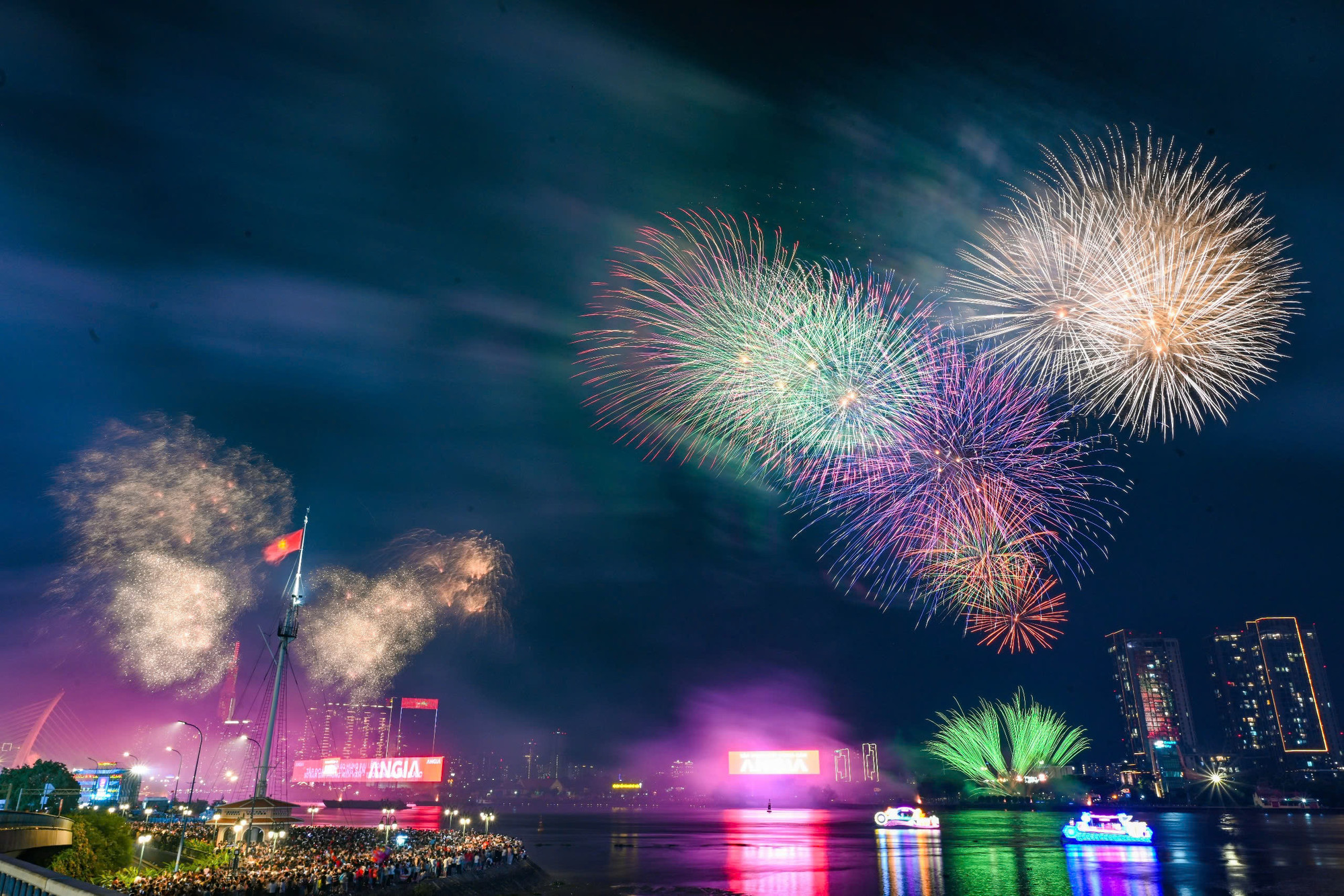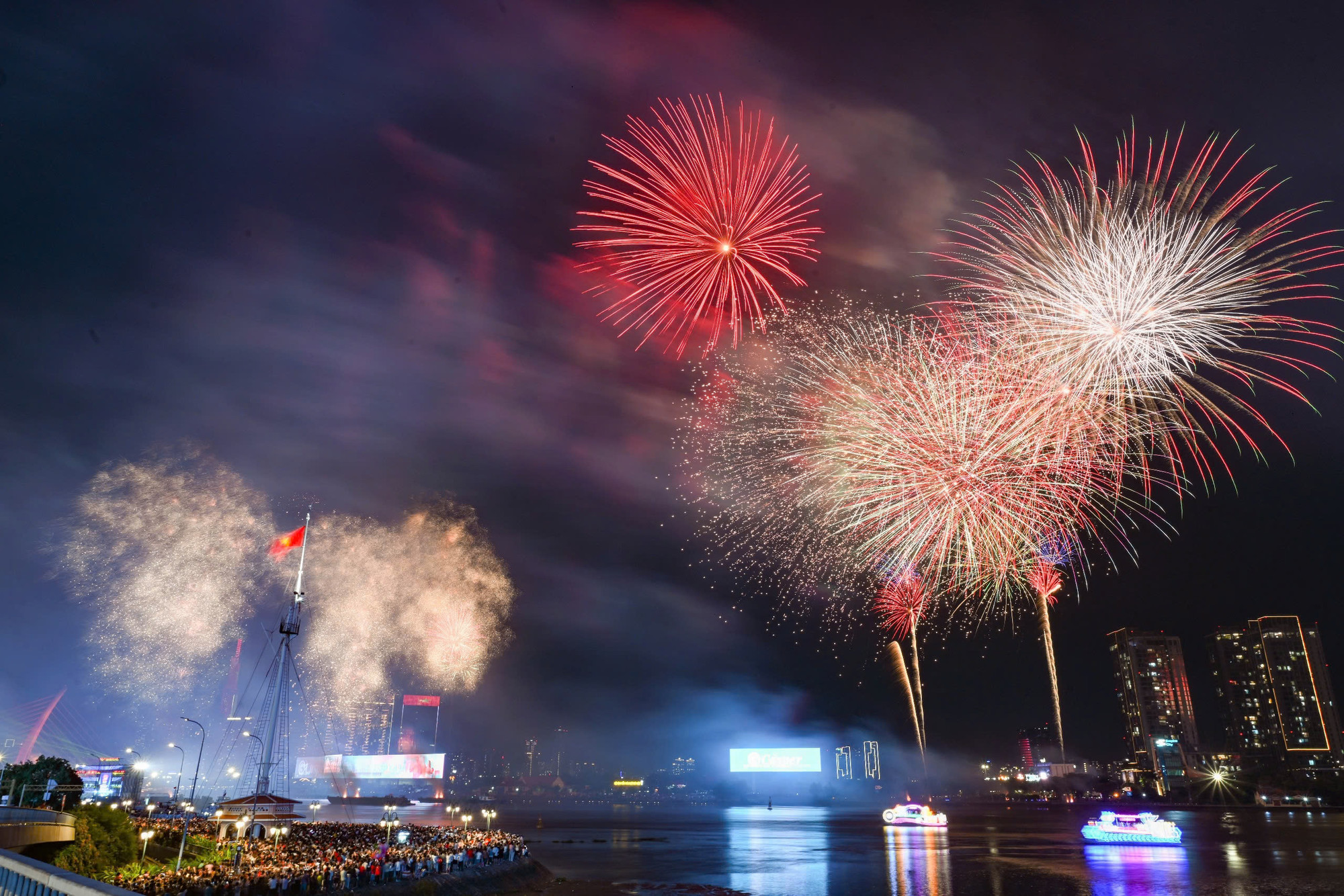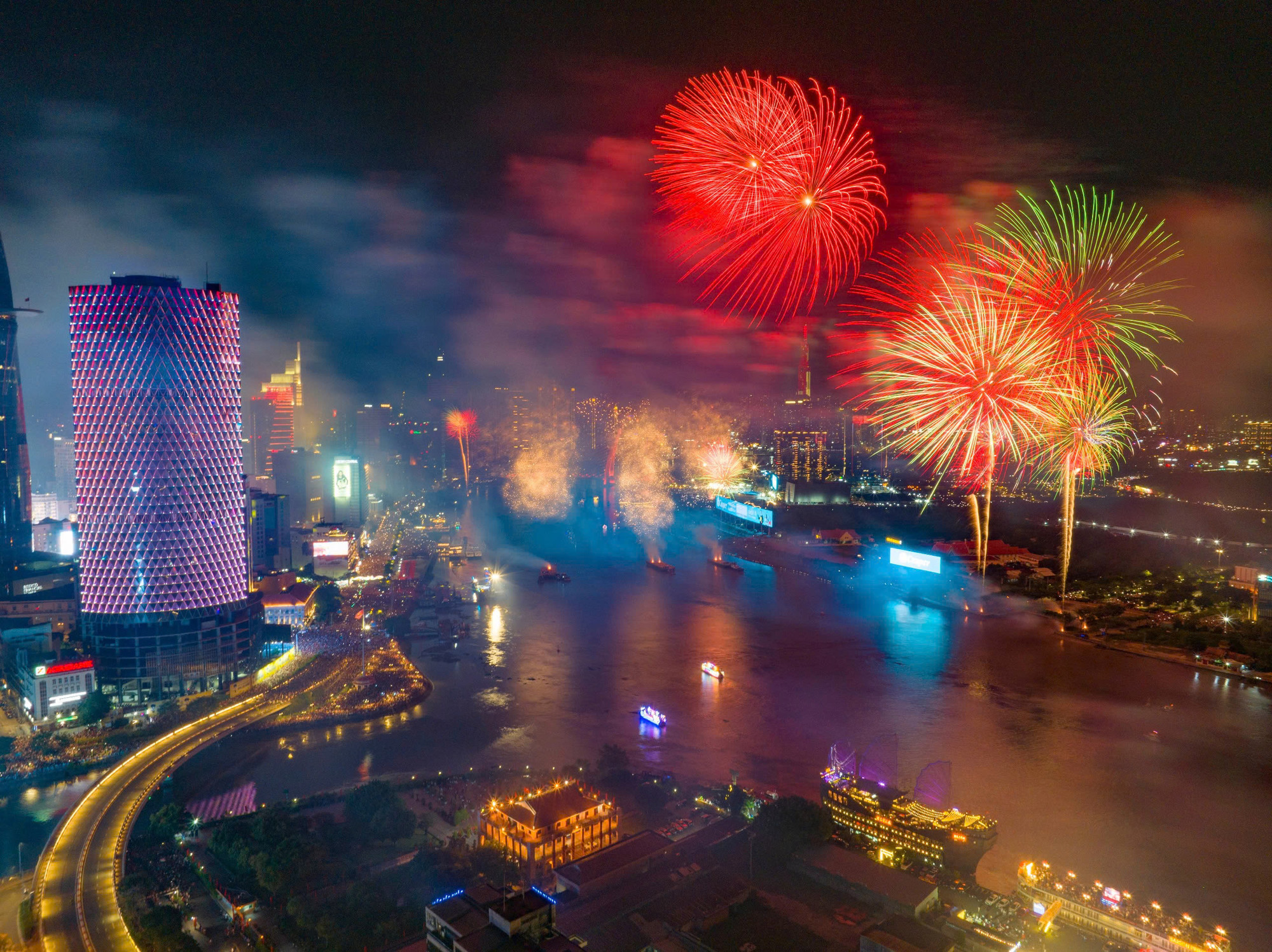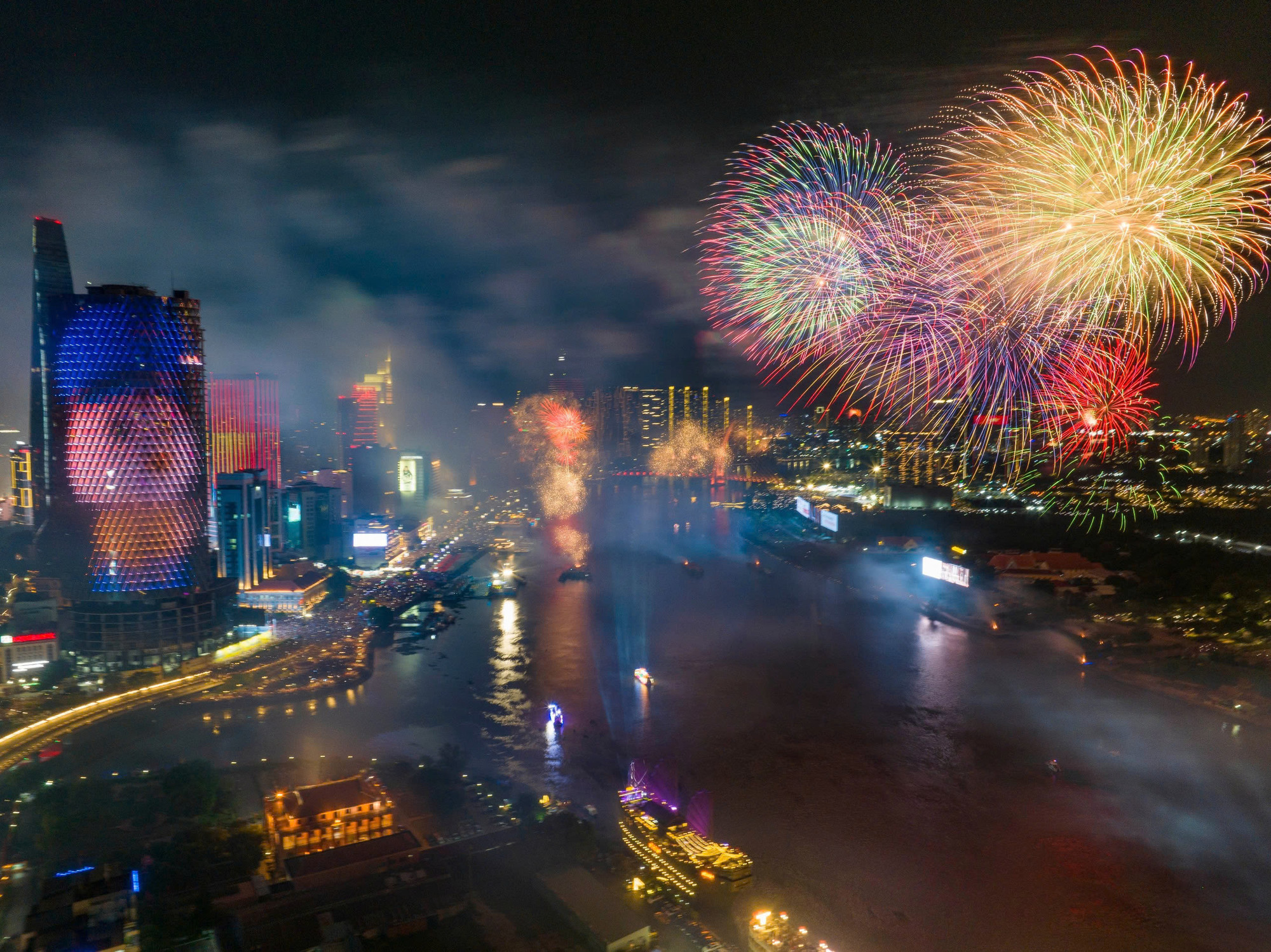 | Pháo hoa rực rỡ nhìn từ sông Sài Gòn. |