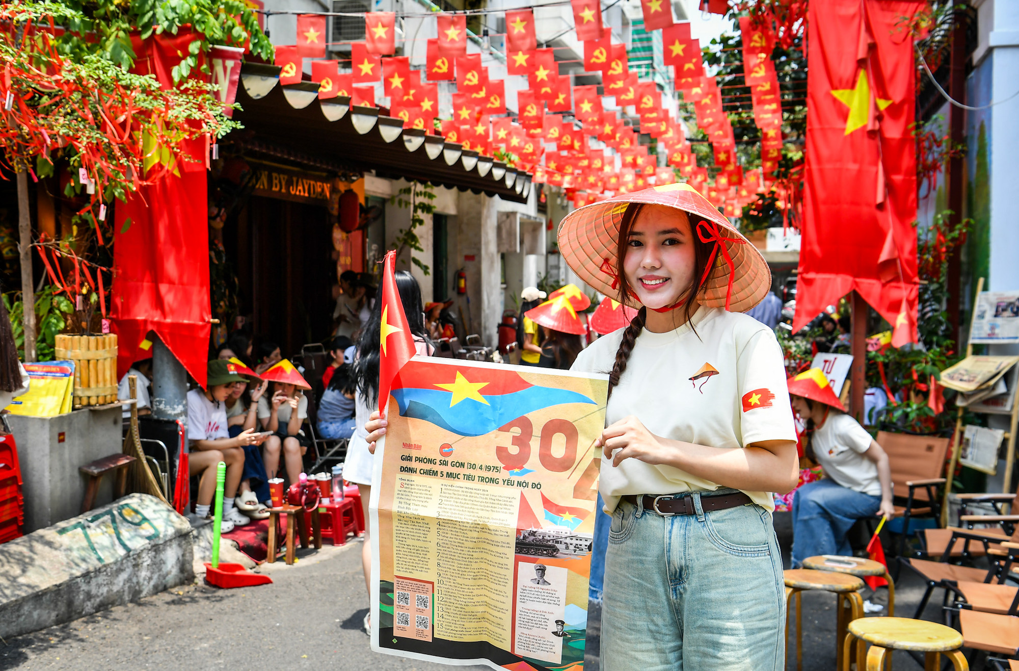 Trong không khí kỷ niệm 50 năm Ngày giải phóng miền Nam, thống nhất đất nước, bạn Nguyễn Huyền Trang lựa chọn diện áo dài xanh đơn giản, cầm trên tay ấn phẩm phụ san của Báo Nhân Dân.