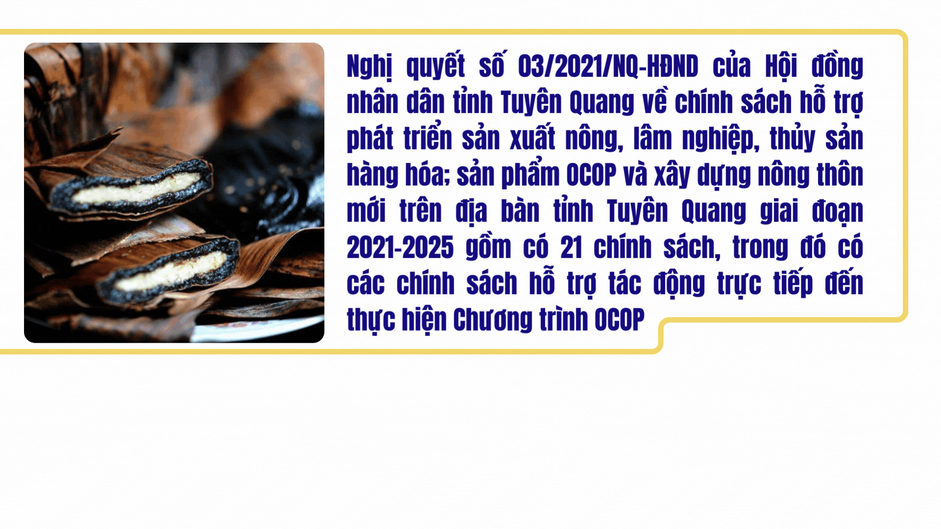 Nghị quyết số 03/2021/NQ-HĐND ngày 16/7/2021 của Hội đồng nhân dân tỉnh về chính sách hỗ trợ phát triển sản xuất nông, lâm nghiệp, thủy sản hàng hóa; sản phẩm OCOP và xây dựng nông thôn mới trên địa bàn tỉnh Tuyên Quang giai đoạn 2021-2025 có tổng số 21 chính sách, trong đó có các chính sách hỗ trợ tác động trực tiếp đến thực hiện Chương trình OCOP.