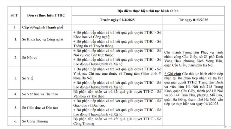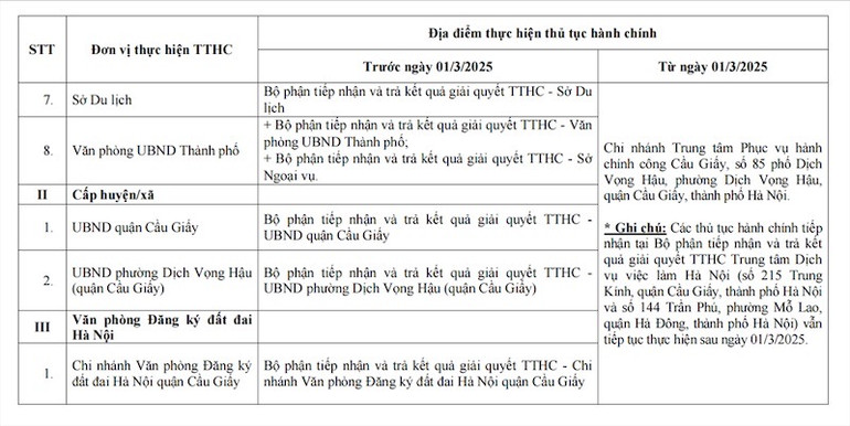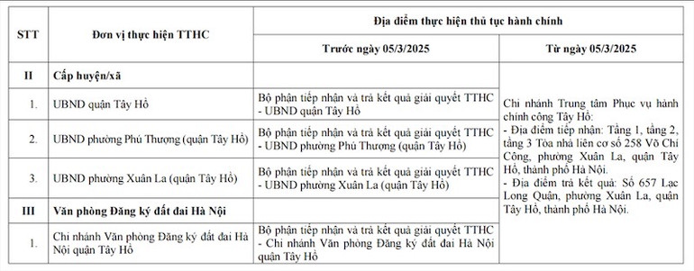 Trung tâm Phục vụ hành chính công thành phố Hà Nội điều chỉnh địa điểm thực hiện thủ tục hành chính tại Bộ phận tiếp nhận và trả kết quả giải quyết thủ tục hành chính của các Sở, ngành thành phố; Ủy ban nhân dân quận Tây Hồ, UBND phường Xuân La (quận Tây Hồ), Ủy ban nhân dân phường Phú Thượng (quận Tây Hồ); Ủy ban nhân dân quận Cầu Giấy, Ủy ban nhân dân phường Dịch Vọng Hậu (quận Cầu Giấy); chi nhánh Văn phòng Đăng ký đất đai Hà Nội quận Tây Hồ, chi nhánh Văn phòng Đăng ký đất đai Hà Nội quận Cầu Giấy.