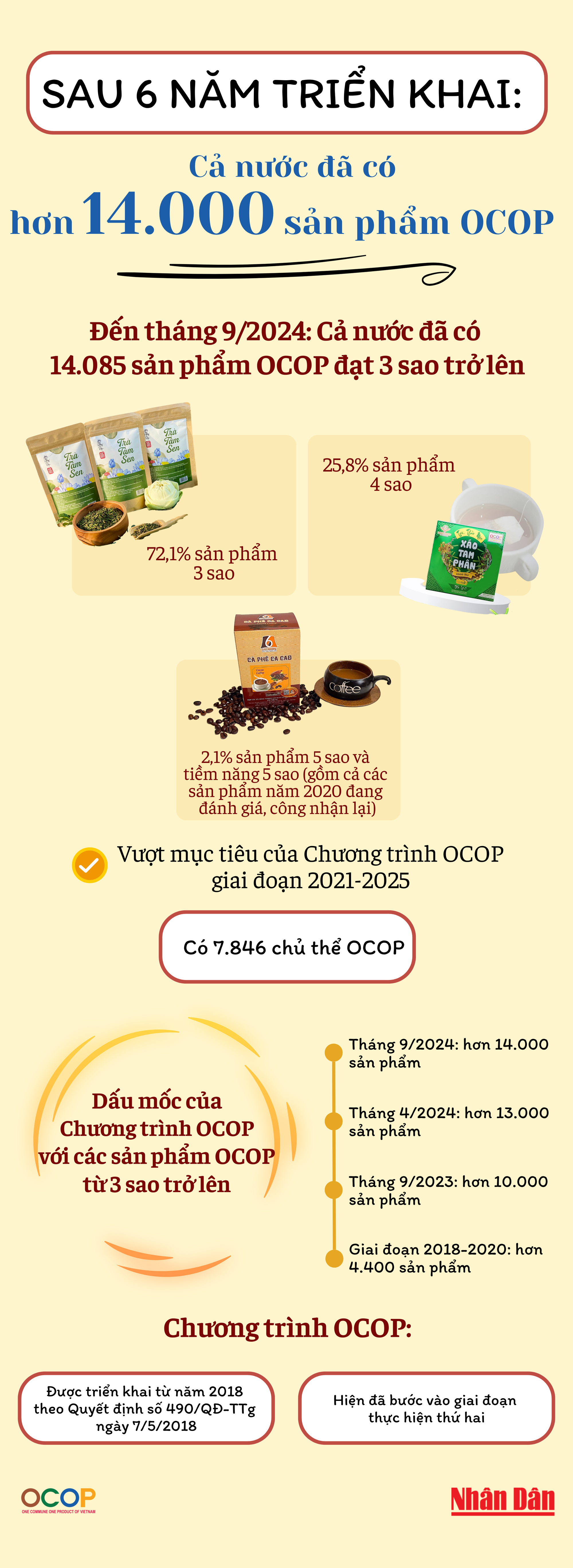 Theo Bộ Nông nghiệp và Phát triển nông thôn, tính đến tháng 9/2024, cả nước đã có 14.085 sản phẩm OCOP đạt 3 sao trở lên. Sau hơn 6 năm triển khai,