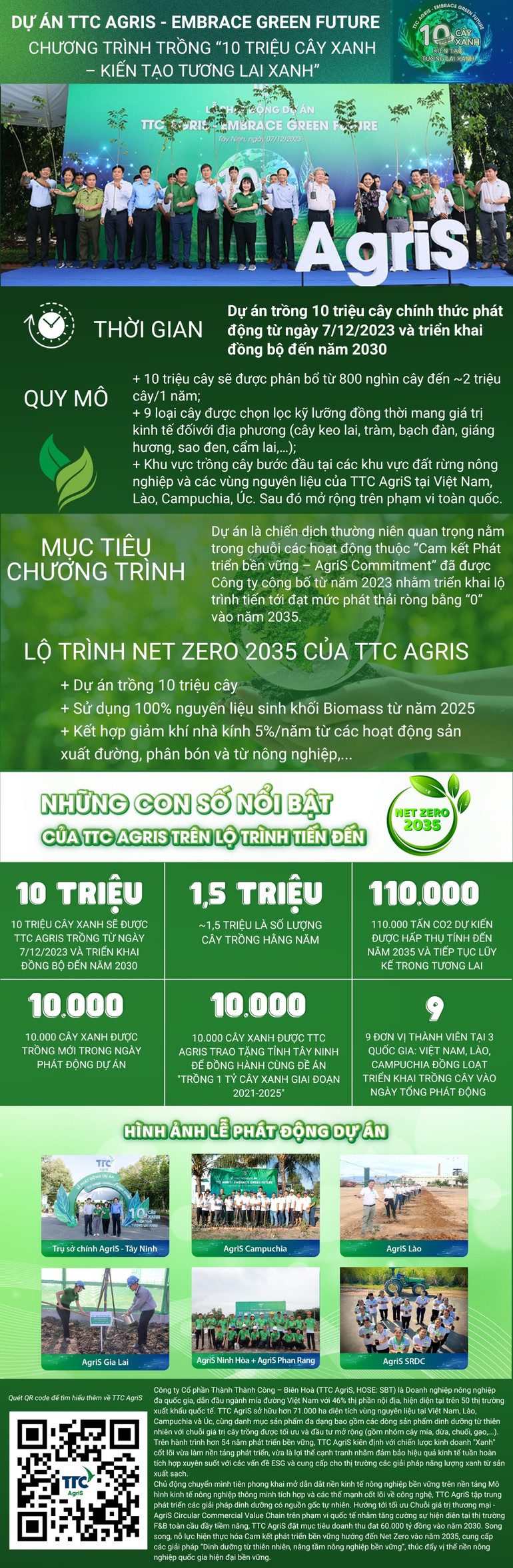 Hơn 10.000 cây xanh đã được đồng loạt trồng trong ngày phát động Dự án trồng 10 triệu cây xanh của Công ty CP Thành Thành Công – Biên Hòa (TTC AgriS, HOSE: SBT) trên phạm vi toàn quốc và các quốc gia lân cận. Khởi động từ 2023 đến 2035, Dự án trồng 10 triệu cây xanh là trọng tâm giúp TTC AgriS tiến tới Net Zero, đóng góp cho cộng đồng, tạo hiệu ứng lan tỏa một cách tự nhiên và hữu ích. TTC AgriS cũng đặt kỳ vọng phát triển cơ hội hợp tác chặt chẽ với chính quyền địa phương, cũng như các tổ chức có cùng định hướng và các chuyên gia trong ngành cùng cung cấp các giải pháp phù hợp nhằm cải thiện môi trường xanh đẹp hơn.