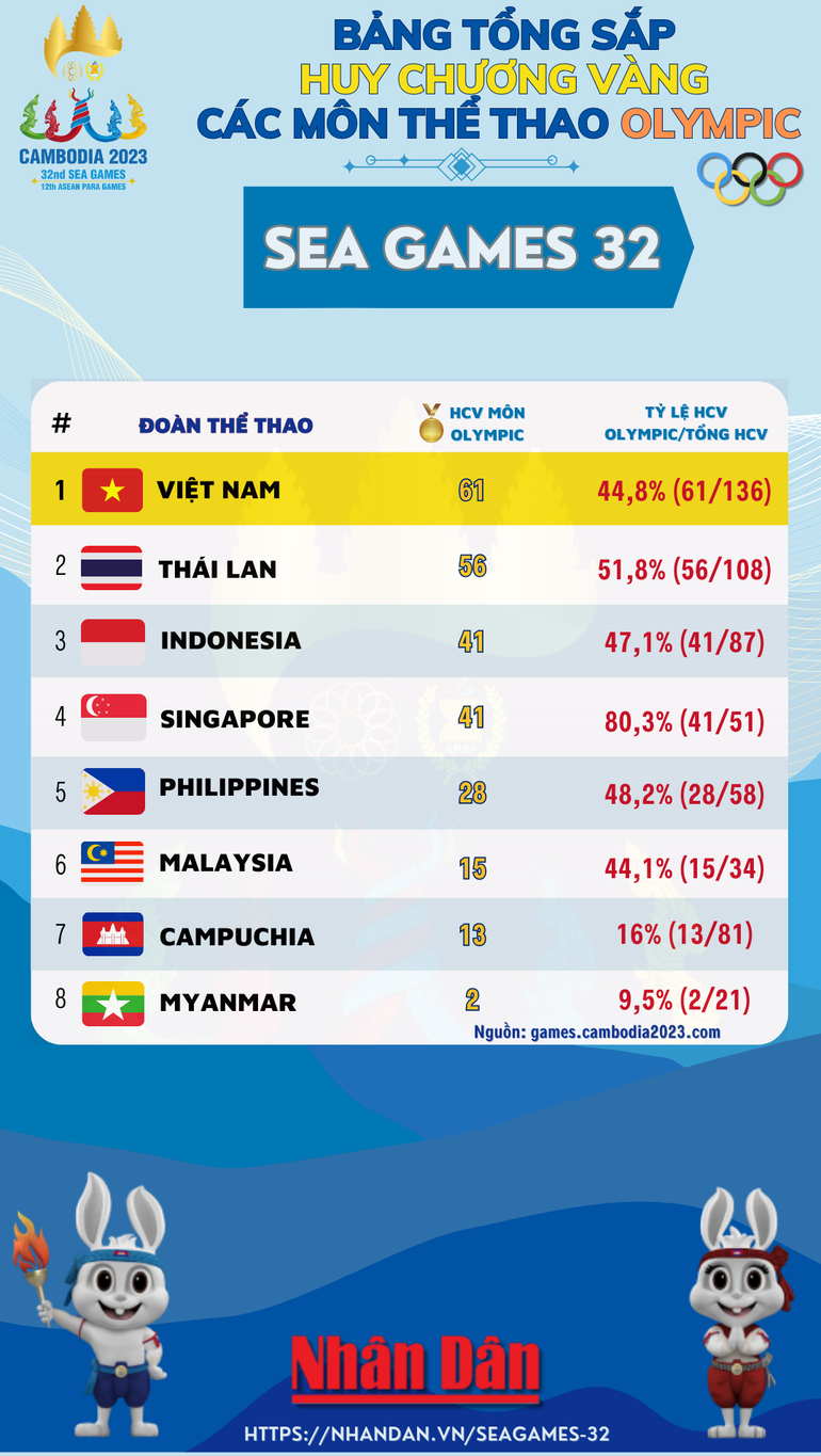Theo đó, Đoàn Việt Nam giành 61/136 Huy chương Vàng, dẫn đầu bảng tổng sắp nhờ đồng đều ở các môn từ điền kinh, bơi đến các thế mạnh về môn võ, đấu kiếm, cử tạ… Trong khi đó, số Huy chương Vàng của Đoàn Thái Lan là 56/108, xếp thứ hai toàn đoàn.