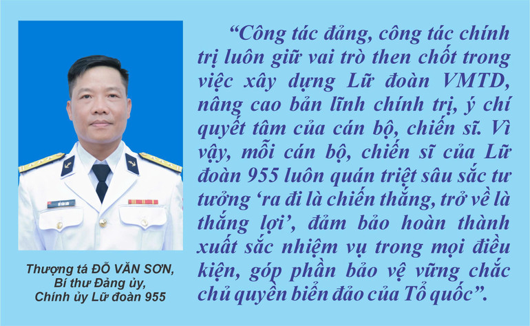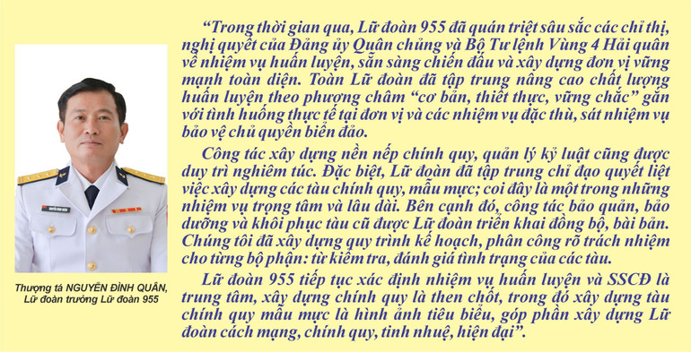 | THÀNH TÍCH NỔI BẬT Lữ đoàn 955 đã được cấp trên đề nghị Thủ tướng Chính phủ tặng Bằng khen; được Bộ Quốc phòng tặng Bằng khen năm 2023, Bộ Tư lệnh Hải quân tặng thưởng Cờ thi đua các năm 2018, 2022, 2023, 2024. Lữ đoàn liên tục đạt danh hiệu “Đơn vị quyết thắng”. |
