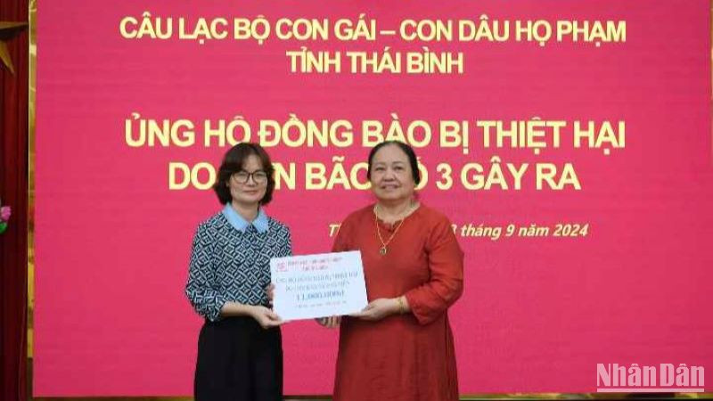 Bên cạnh đó, nhiều tổ chức, cá nhân trực tiếp đến trao hỗ trợ cho Ủy ban Mặt trận Tổ quốc Việt Nam tỉnh Thái Bình như: Câu lạc bộ sản xuất kinh doanh giỏi Thái Bình trao 3 triệu đồng; Câu lạc bộ con gái-con dâu họ Phạm tỉnh Thái Bình trao 11 triệu đồng; Hội đồng họ Phạm tỉnh Thái Bình cũng đến gửi hỗ trợ 15 triệu đồng… Số tiền dù không nhiều, nhưng thể hiện tình cảm, lan tỏa yêu thương đến đồng bào bị thiệt hại trong bão lũ.