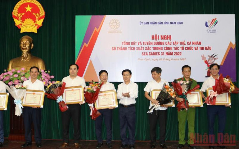 Tại hội nghị, Chủ tịch UBND tỉnh Nam Định Phạm Đình Nghị đã trao tặng Bằng khen của UBND tỉnh cho 4 cá nhân có thành tích xuất sắc trong thi đấu tại SEA Games 31 gồm: Các vận động viên Nguyễn Thị Huyền, Nguyễn Thị Thảo; các huấn luyện viên Phạm Văn Chinh, Nguyễn Thị Mai Hương; trao tặng Bằng khen cho 7 tập thể có thành tích xuất sắc trong công tác tổ chức tại SEA Games 31, gồm: Sở Văn hóa, Thể thao và Du lịch; Công an tỉnh; Sở Y tế; UBND thành phố Nam Định; Công an thành phố Nam Định; Trung tâm Thể thao Thành tích cao tỉnh và Điện lực thành phố Nam Định.