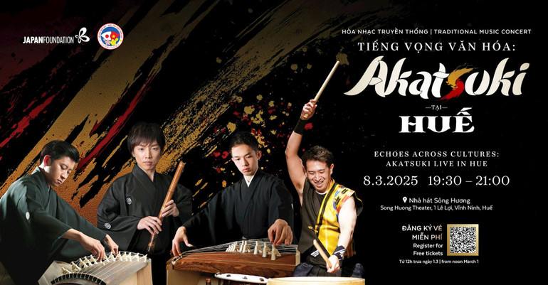Tối 8/3, tại Nhà hát Sông Hương, thành phố Huế, lần đầu tiên, nhóm nhạc AKATSUKI (tiếng Nhật, có nghĩa là bình minh), gồm bốn nghệ sĩ hàng đầu của Nhật Bản, có buổi trình diễn nghệ thuật đặc sắc mang tiêu đề “Tiếng vọng văn hóa”. Khán giả có dịp thưởng thức những giai điệu truyền thống, thanh âm từ nhạc cụ truyền thống của xứ sở mặt trời mọc hòa quyện sắc màu âm nhạc đương đại. Sau đêm diễn, AKATSUKI còn thực hiện một số buổi biểu diễn nhỏ tại bốn trường học ở Huế, giới thiệu đến học sinh vẻ đẹp của nghệ thuật biểu diễn Nhật Bản. Chương trình do Quỹ Giao lưu quốc tế Nhật Bản Japan Foundation tổ chức với sự phối hợp của Hội Hữu nghị Việt-Nhật thành phố Huế.