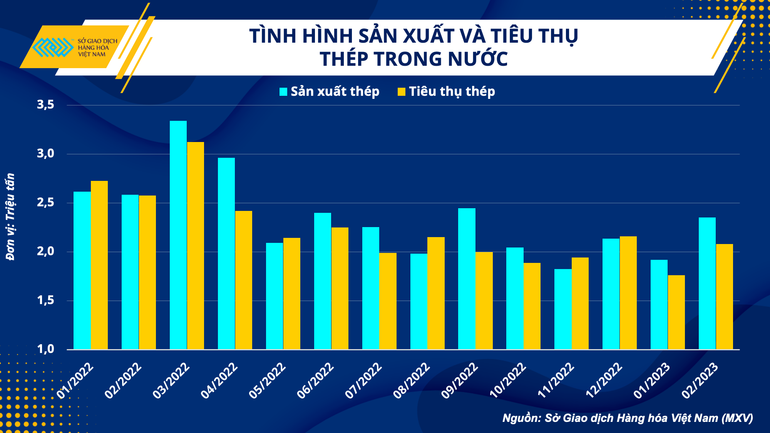 Theo báo cáo từ Hiệp hội thép Việt Nam, mặc dù sản xuất và tiêu thụ thép trong tháng 2 có sự khởi sắc hơn so với tháng 1, nhưng xét trong 2 tháng đầu năm 2023, sản xuất thép thành phẩm đạt 4,2 triệu tấn, giảm 16,3% so với cùng kỳ năm 2022. Bán hàng thép thành phẩm đạt 3,8 triệu tấn, cũng giảm 23,2% so với cùng kỳ năm ngoái.