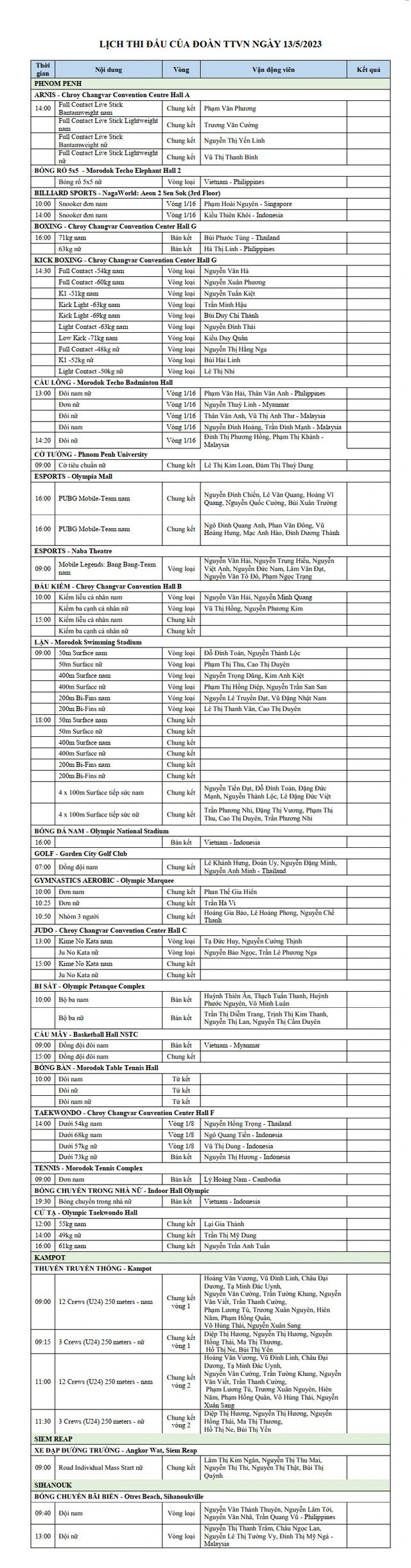 Trong ngày thi đấu 12/5, Đoàn thể thao Việt Nam tiếp tục duy trì vị trí số 1 trên bảng tổng sắp huy chương SEA Games 32 khi các vận động viên mang về 13 Huy chương Vàng, 10 Huy chương Bạc và Huy chương Đồng đến từ các môn: Wushu, Taekwondo, điền kinh, đấu kiếm, quần vợt hay lặn.