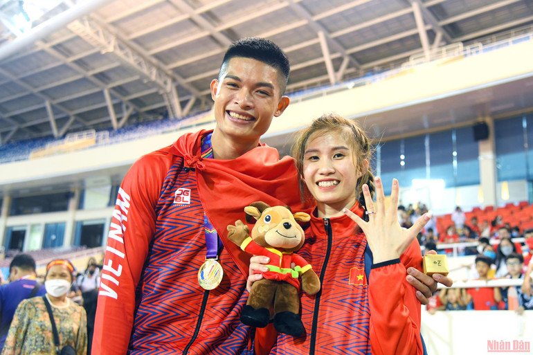 Trao đổi với phóng viên Báo Nhân Dân, Tiến Trọng cho hay: “Chúng tôi có cơ hội gặp nhau tại trung tâm huấn luyện, từ đó đã tìm hiểu và yêu nhau. Bước vào SEA Games 31, bản thân tôi đặt mục tiêu phải giành được Huy chương Vàng để cầu hôn Trinh. Bởi tôi luôn muốn mang những điều hạnh phúc nhất đến cho người mình yêu”.