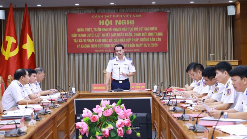Phát biểu kết luận Hội nghị, Thiếu tướng Vũ Trung Kiên, Phó Tư lệnh Pháp luật Cảnh sát biển Việt Nam đề nghị các cơ quan, đơn vị quán triệt nghiêm túc chỉ đạo của các cấp, tổ chức xây dựng kế hoạch tiếp tục thực hiện đợt cao điểm, quyết tâm ngăn chặn, chấm dứt tình trạng tàu cá vi phạm khai thác IUU trước ngày 15/11/2025.