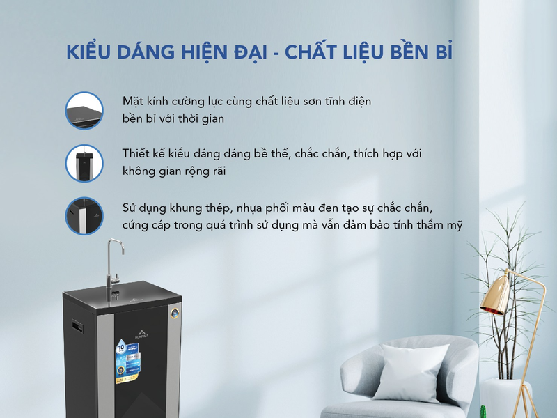 - Trang bị nhiều lõi lọc, cho ra nguồn nước sạch, giàu khoáng chất.