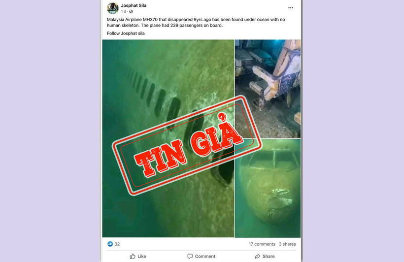 Một bài đăng trên Twitter cho thấy hình ảnh chụp mặt trước của một chiếc máy bay rỉ sét phủ đầy tảo, kèm theo dòng mô tả: “Máy bay Malaysia MH370 biến mất 9 năm trước đã được tìm thấy dưới đáy đại dương mà không có bộ xương người nào. Có 239 trên chuyến bay này”. Bài đăng đã thu hút hàng chục nghìn lượt thích (like).
